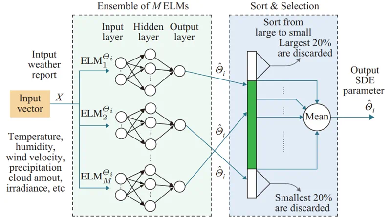 将运行日白天m小时的气象数据(包括温度、降水量、辐照强度、云量、风速、风向等)作为输入,求取其至该m小时SDE参数的映射。为此,首先分别基于伊藤等距(Itô’s isometry)原理和鞅似然估计(martingale likelihood estimation),估计训练集中各小时光伏出所对应SDE模型的参数。而后,如图2所示,通过ELM集成学习,构造气象数据到光伏出力SDE模型参数的映射。