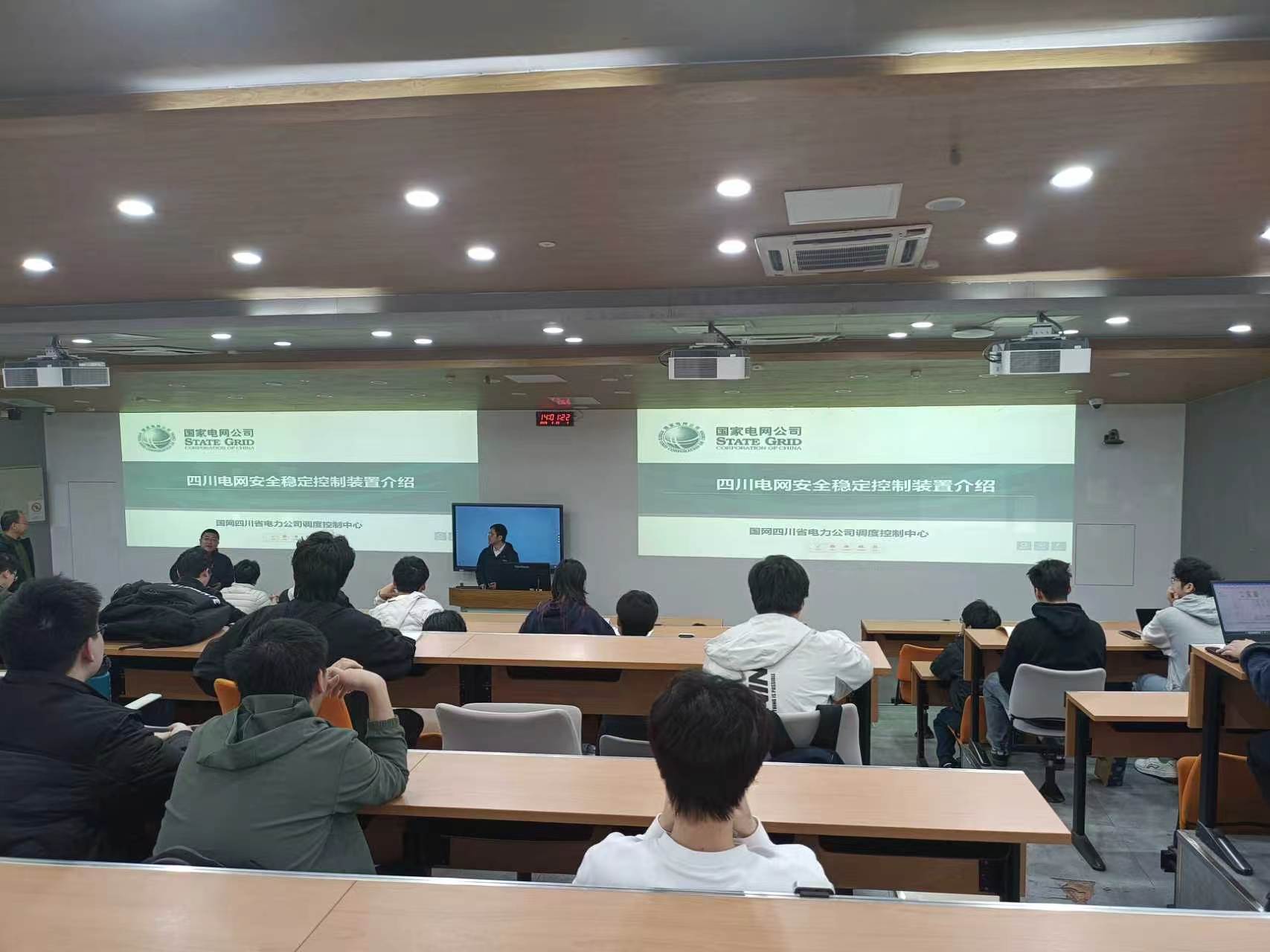 2026年3月25日下午14:00四川大学望江校区基础教学楼C101教室,《电力系统安控与自动装置》课程开展了本学期第一次企业专家进课堂活动。国网四川省电力公司调度控制中心保护处蒋星燃专家应邀作为主讲人,开展“从电力系统‘三道防线’看四川电网”的学术讲座。郑子萱教授主持本次活动。
