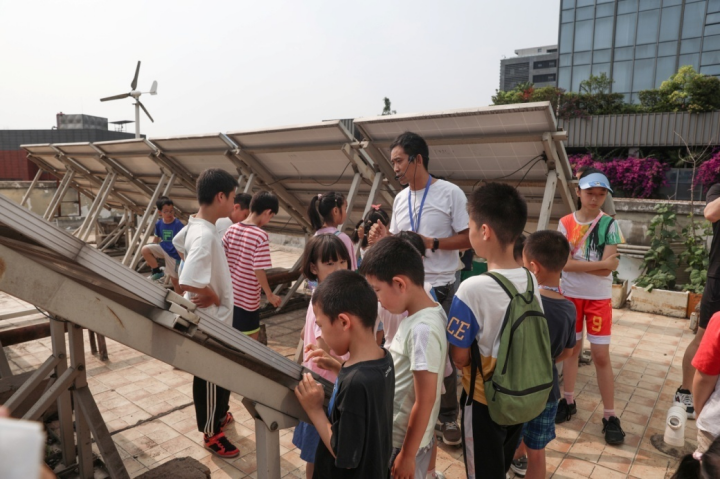 在实验楼顶楼小朋友们近距离观摩了以前只在电视里见过的太阳能光伏板和风机,了解了光伏发电与风力发电的原理,对清洁新能源发电有了具体的认识。
