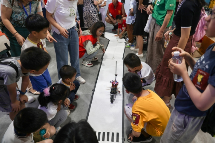 在三楼罗克韦尔实验室,黄涛老师讲解了大型并联机器人娴熟的绘画技艺,三支机械臂在计算机控制下精画出太阳公公的卡通形象,引起小朋友们一片惊叹。院智能车协会的同学播放了川大火锅战队参加全国高校机甲大赛的精彩视频,并现场演示了两种赛车的比赛情形,激发了小朋友们极大的兴趣。